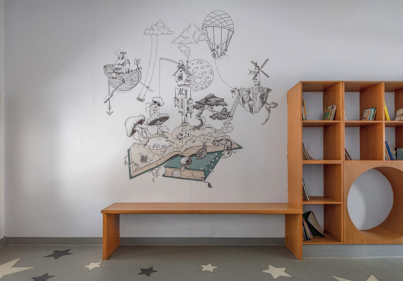 The outside envelope of the building is designed as a playscape. A two dimensional ground transitions from grass to blocks of colour, continuing into the façade with playful forms protruding out of it in varying colours and materials. Translucency in the punctured volumes was explored through UV resistant PVC and perforated metal.