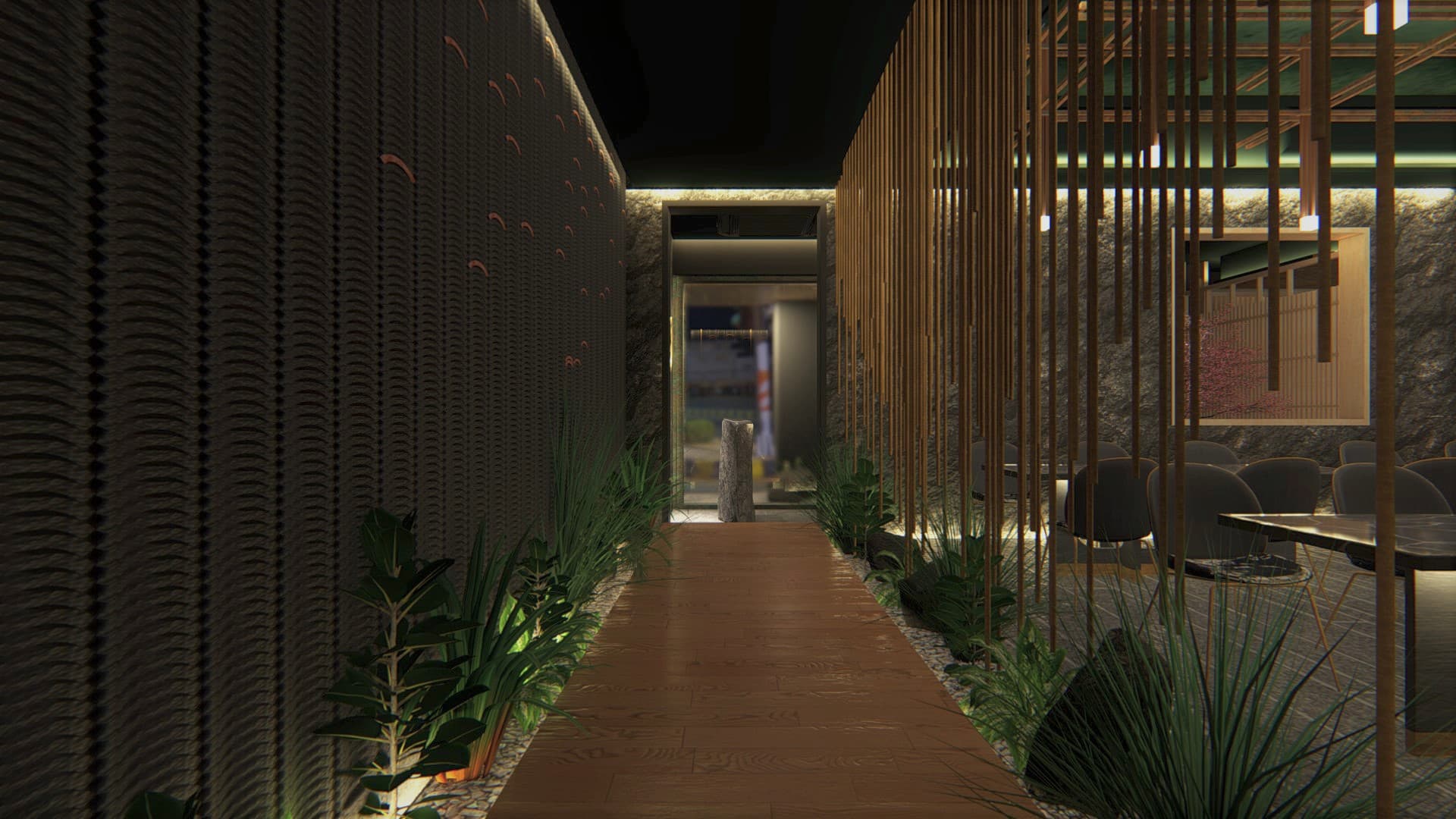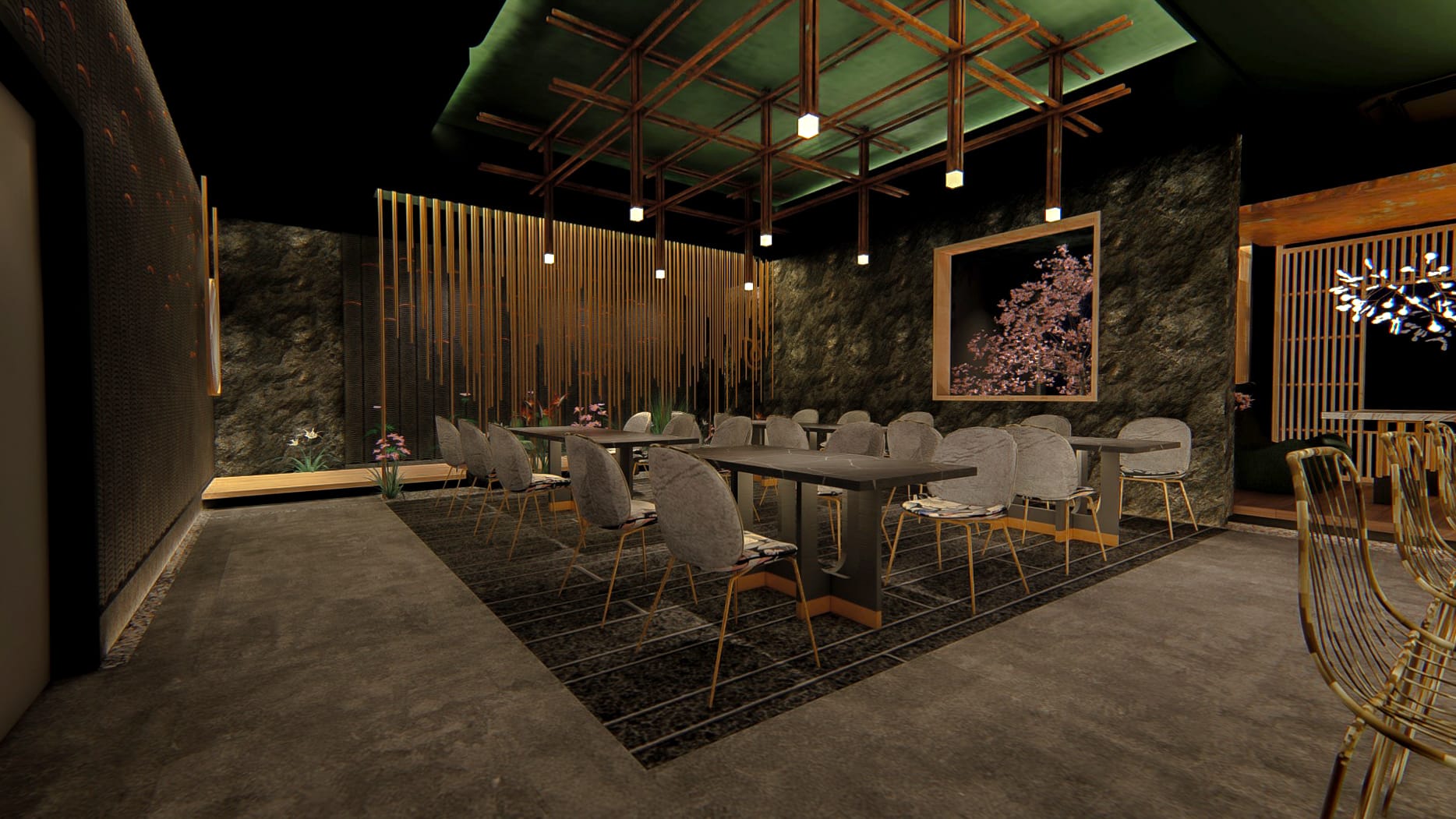 Design Intent: This high-end Japanese dining experience embraces the beauty of natural materials, particularly stone, blurring the boundary between unfinished and refined aesthetics. The design blends rustic and modern elements to create a luxurious ambiance.