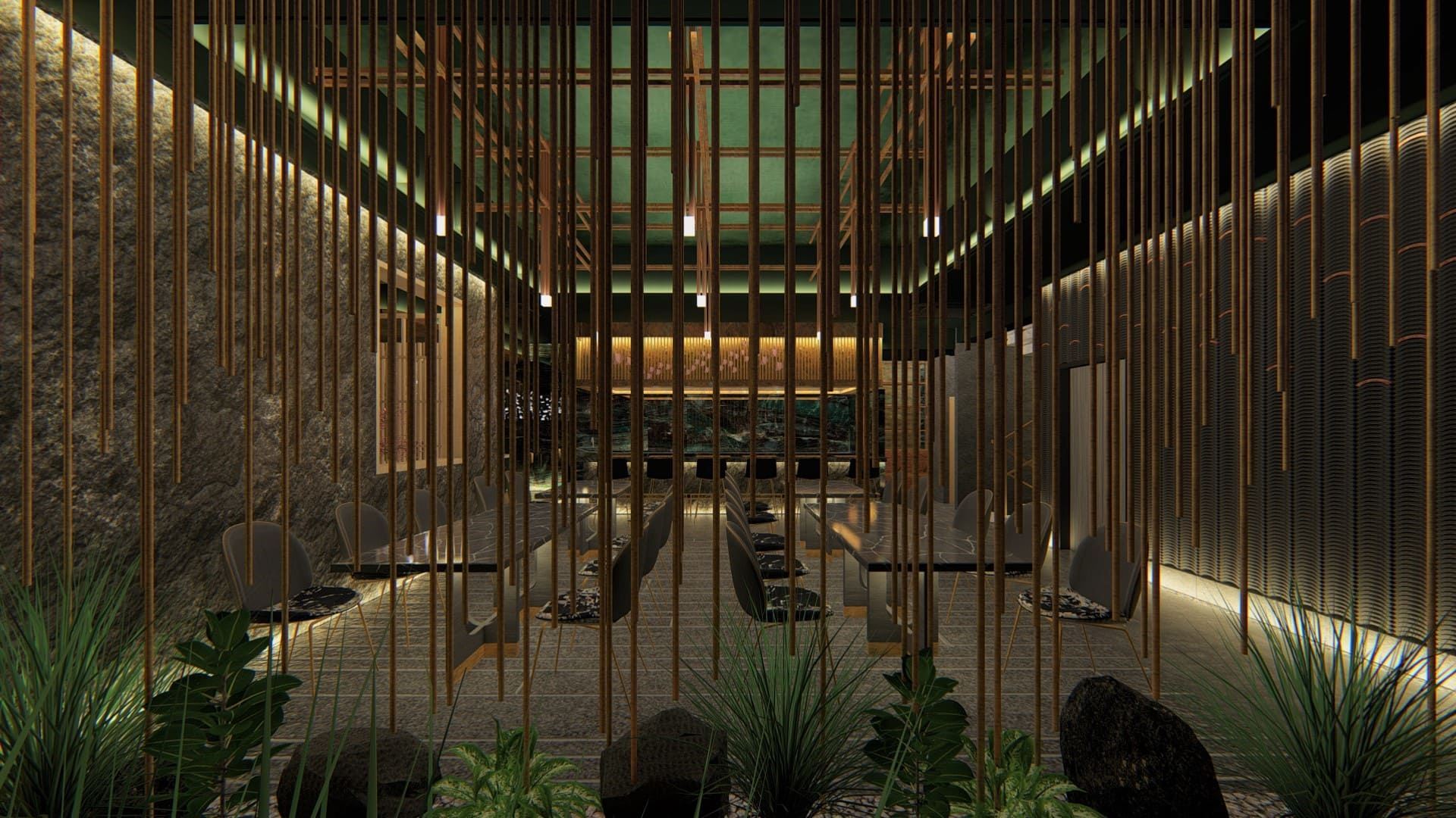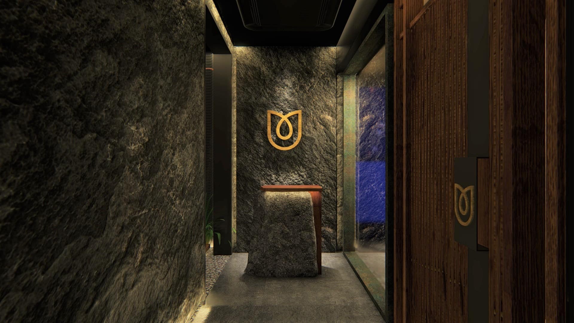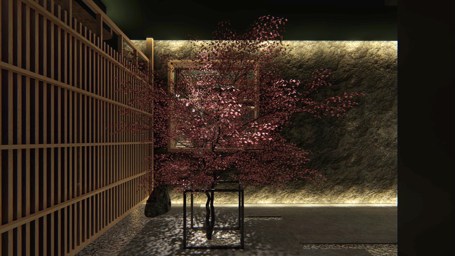 Upon arrival, guests are welcomed into a foyer area adorned with unfinished stone cladding and artificial indoor cherry blossom foliage. The dim lighting and dark walls guide guests along an intimate path, gradually transitioning from opaque to a permeable brass screen suspended from the ceiling.