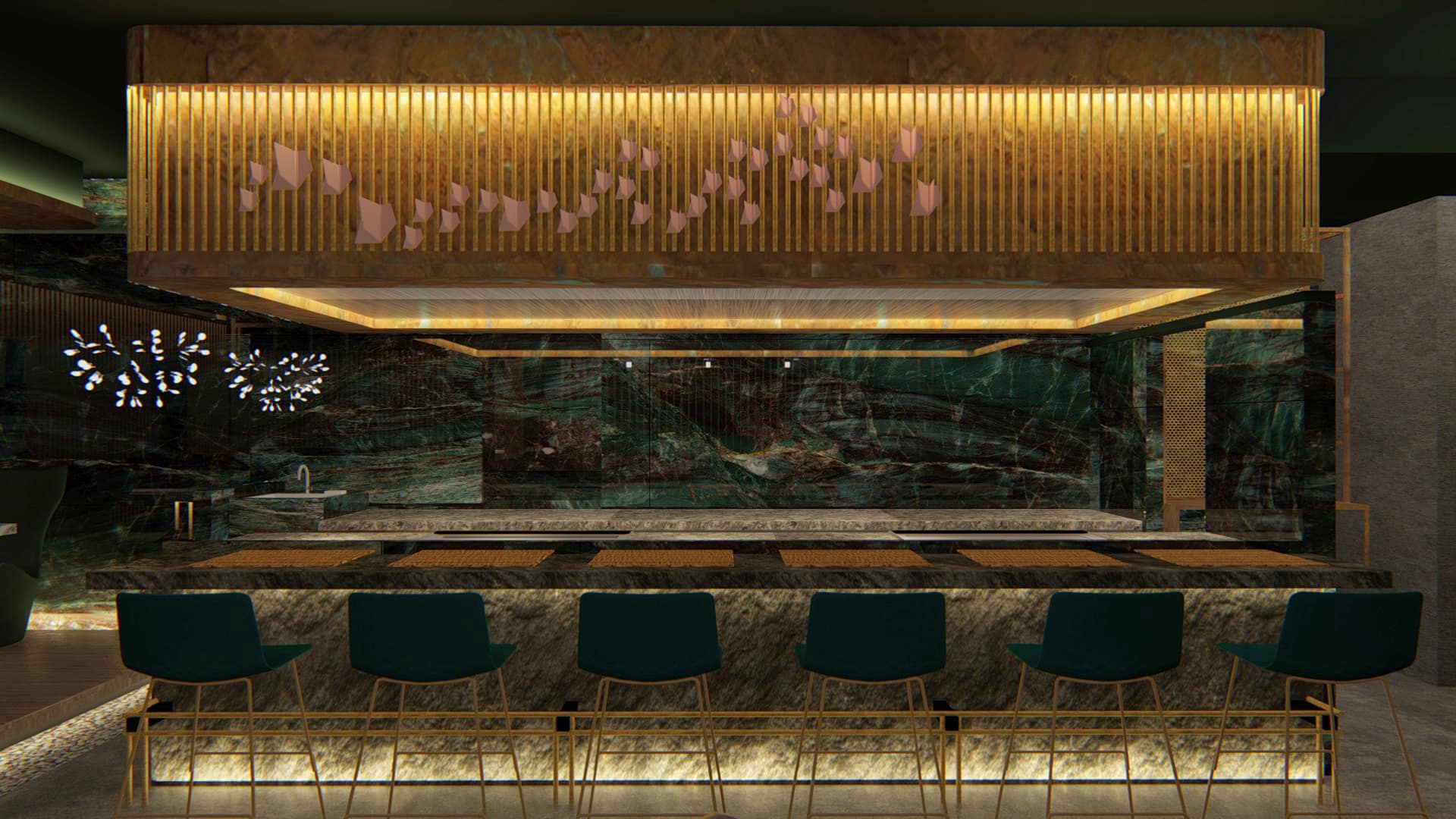 The use of stone cladding persists throughout the dining space as a unifying visual theme. A centralized seating island is strategically placed near a live teppanyaki counter with intricate details against the backdrop of simple stone and marble cladded walls.